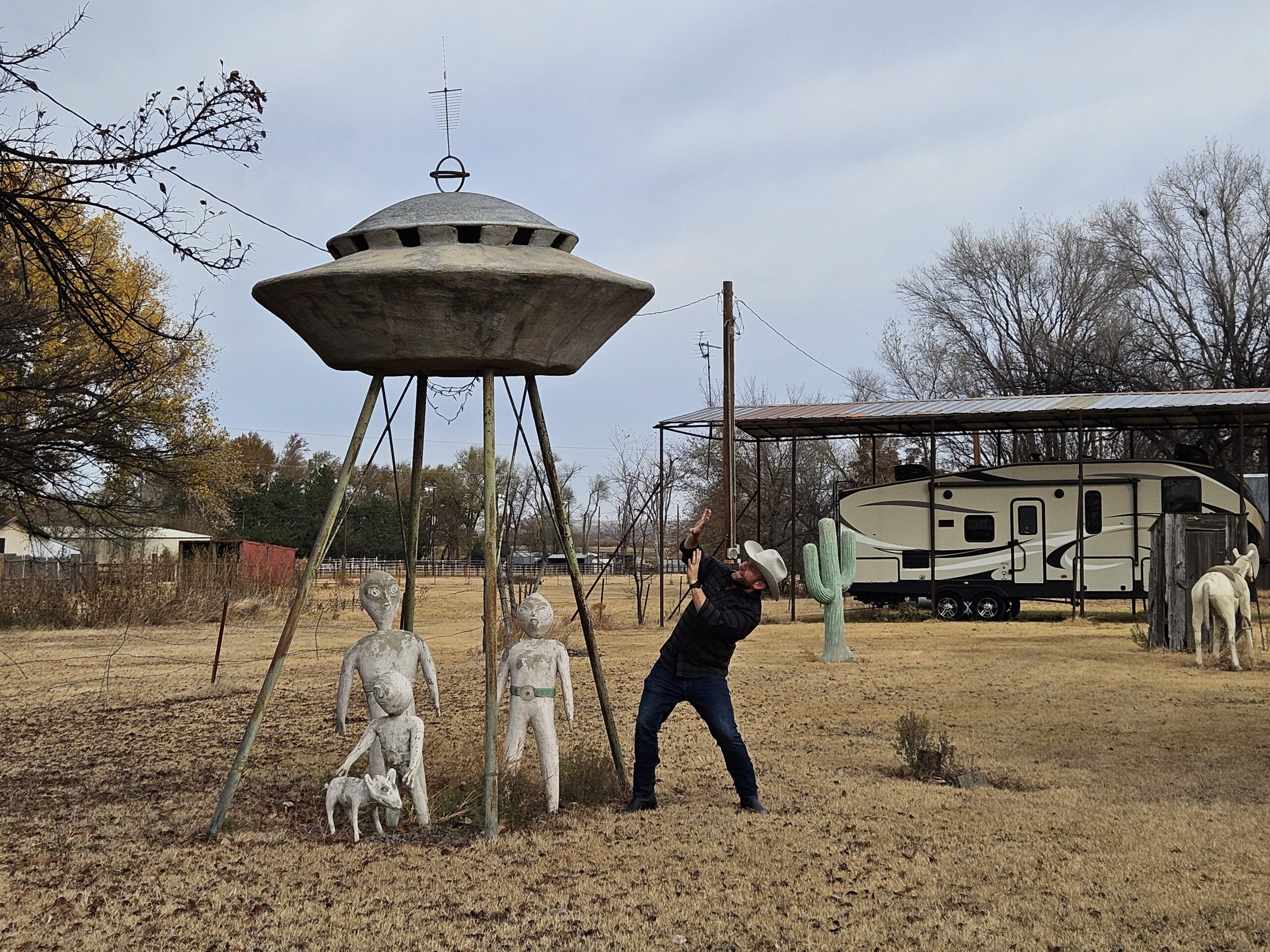 On your way into town, you’re sure to notice the green dinosaur named “AUD” atop a scenic mesa. Artist Gene Cockrell built this roadside attraction so the local kids would know they’re almost home when returning from away games. His yard is full of similar oddities including an alien ship, Barney, and Jesus with a lion and a lamb.
